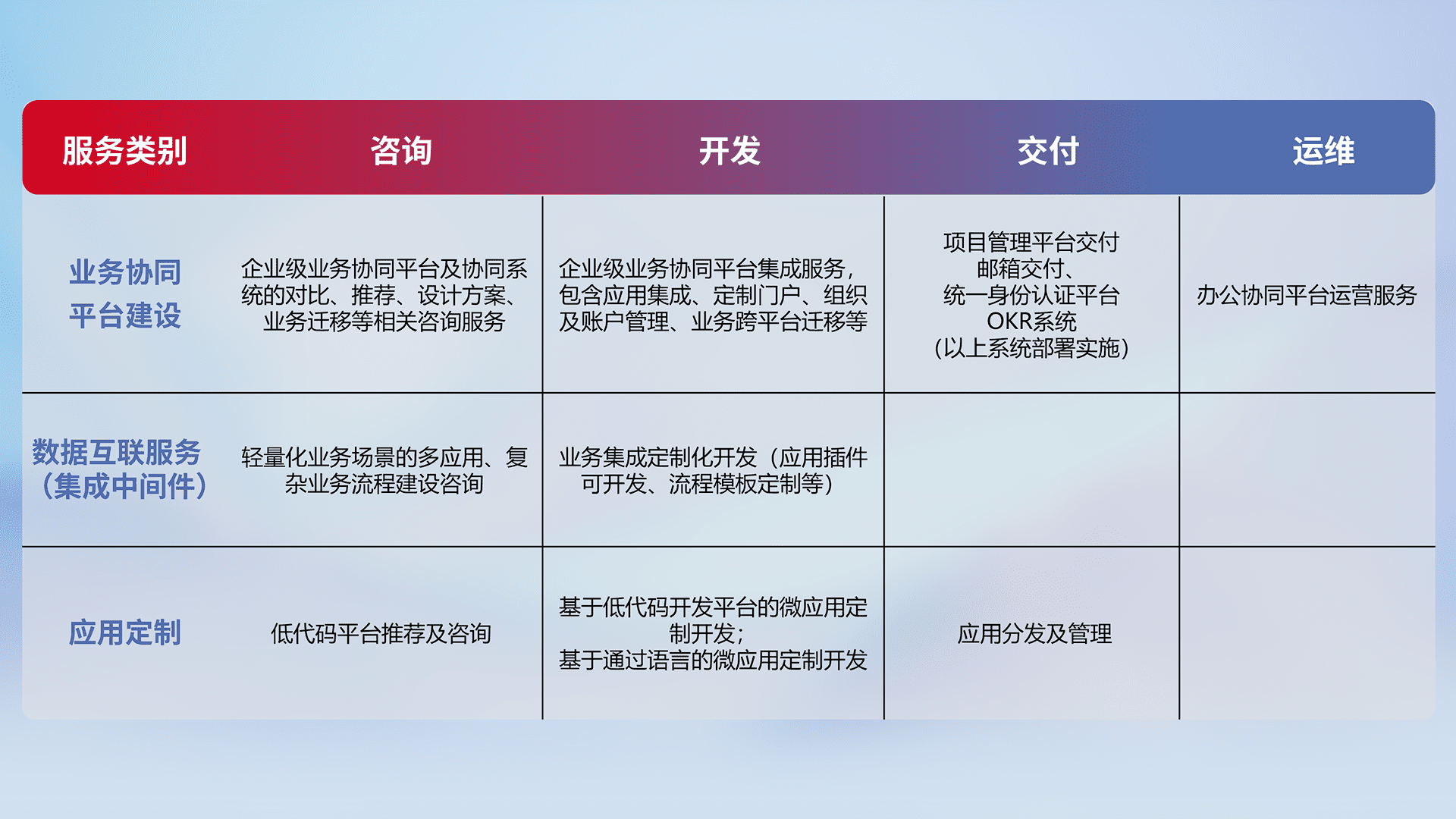 针对钉钉、、、、企微、、、、IDaas等平台级产品提供产品的规划、、、方案、、、、交付、、、定制化开发等服务,,,实现如统一协同办公、、智能客户服务、、、、混合会议管理、、、、智能数据查询、、等业务场景,,,,实现数字化转型。。。